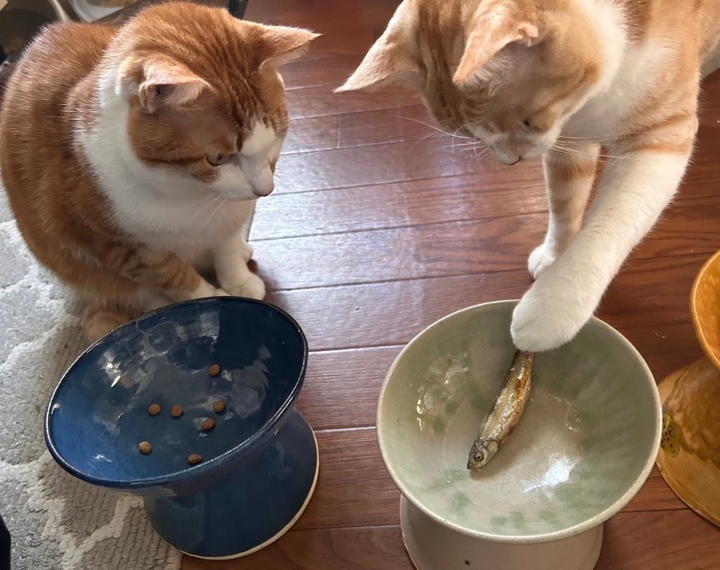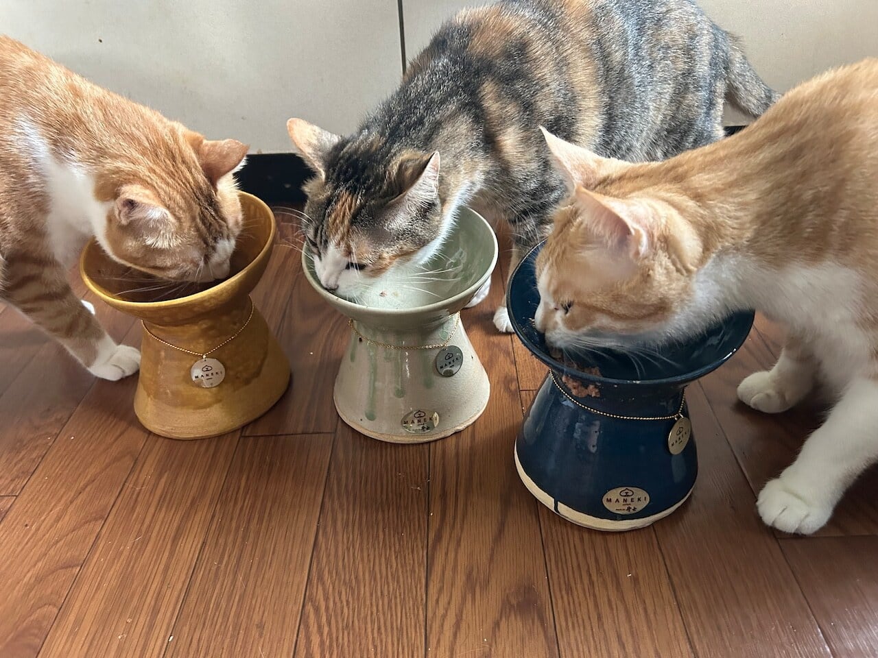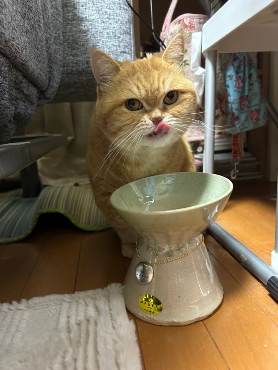 髭が邪魔にならない器の大きさで、自然な姿勢に基づいて快適な食事ができます。また、高さがあるので、頭を下げた姿勢で食べることによって起こる吐き戻しを防止します。