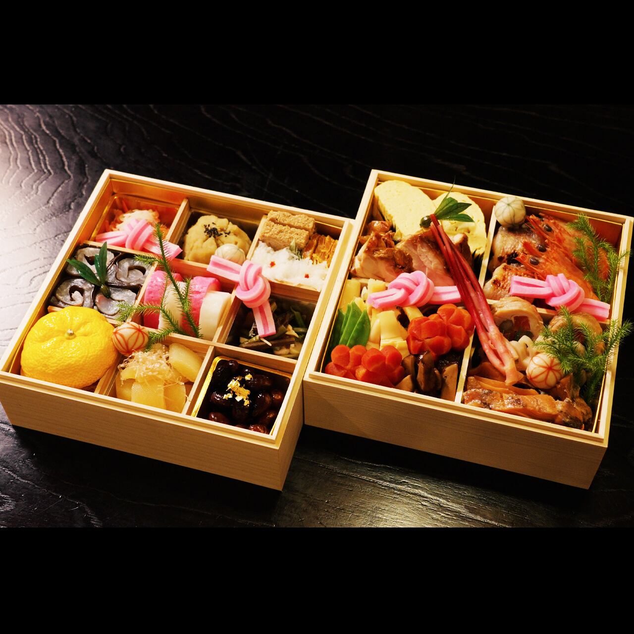 特選二段重は、白木の二段重を器に素材を吟味し、手芸を尽くした京料理の繊細な味わいをお客様の幸せを願い、笑顔を思い浮かべながら、すき間なくお詰めいたします。)
